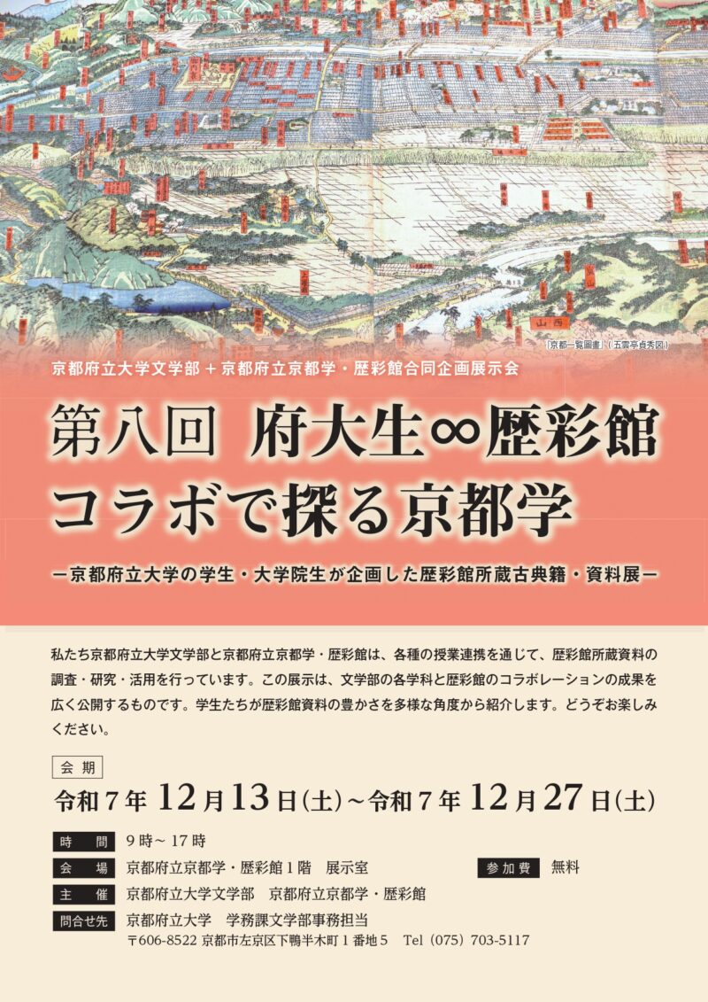 2025年12月13日(土)~12月27日(土)に、京都府立京都学・歴彩館で『[展覧会]京都府立大学文学部+京都府立京都学・歴彩館合同企画展示会「第八回 府大生∞歴彩館 コラボで探る京都学」-京都府立大学の学生・大学院生が企画した歴彩館所蔵古典籍・資料展-』が開催されます。