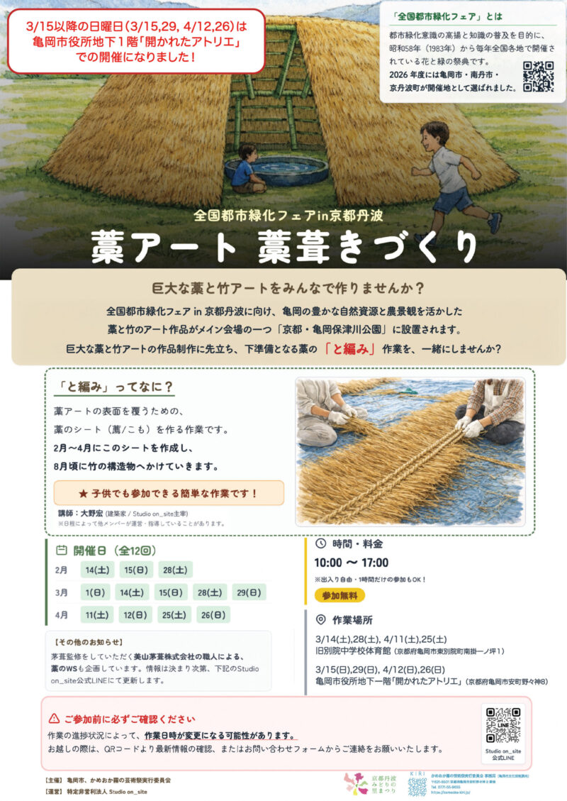 今秋、9月18日〜11月8日で開催される「全国都市緑化フェアin京都丹波」に向けて、京都・亀岡保津川公園に設置される「藁アート」をみんなで制作しています。2月から4月までの約3ヶ月間に渡って実施している「藁アート 藁葺きづくり」では、藁アートの表面を覆うための「薦 / こも」づくりを行っています。
