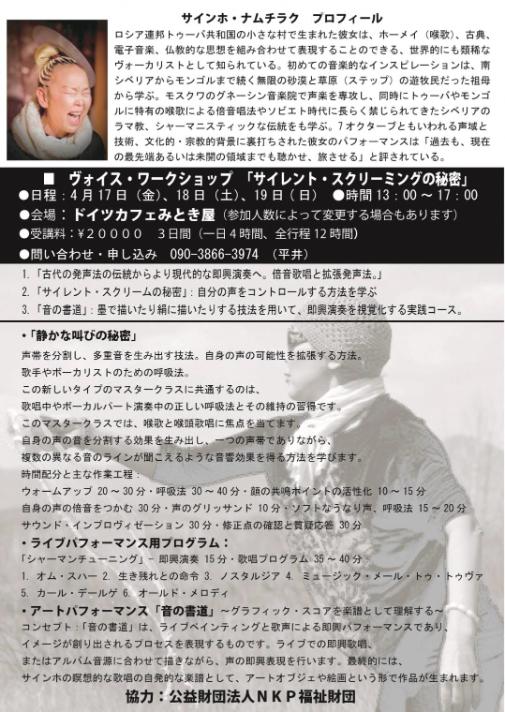 声によるパフォーマンスをされている方、歌唱の可能性を広げてみたい方におすすめのイベントです。声楽家の井尻有香さんが営む「ドイツカフェみとき屋」を会場に、井尻さんが魅了されたロシア連邦トゥーバ共和国生まれのヴォーカリスト、サインホ・ナムチラクさんによるヴォイス・ワークショップが開かれます。7オクターブとも言われる声域と技術をもつサインホさんから、呼吸法や喉歌(ホーメイ)、喉頭をつかった独特の歌唱法などを学べる貴重な機会です。