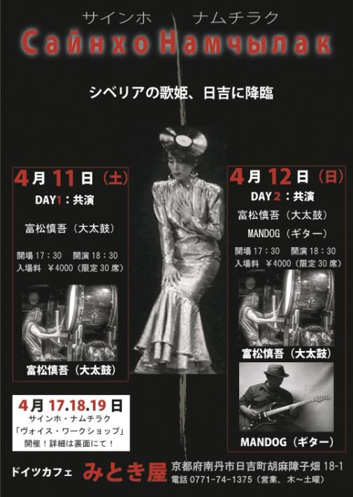 声によるパフォーマンスをされている方、歌唱の可能性を広げてみたい方におすすめのイベントです。声楽家の井尻有香さんが営む「ドイツカフェみとき屋」を会場に、井尻さんが魅了されたロシア連邦トゥーバ共和国生まれのヴォーカリスト、サインホ・ナムチラクさんによるヴォイス・ワークショップが開かれます。7オクターブとも言われる声域と技術をもつサインホさんから、呼吸法や喉歌(ホーメイ)、喉頭をつかった独特の歌唱法などを学べる貴重な機会です。