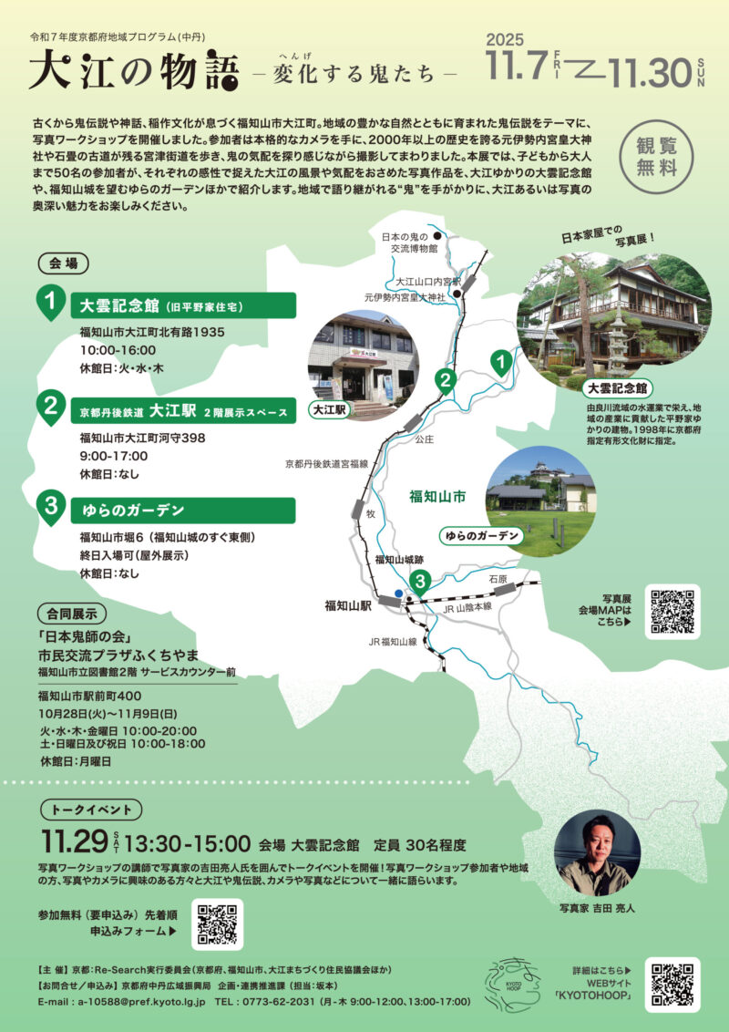 古くから鬼伝説や神話、稲作文化が息づく福知山市大江町。地域の豊かな自然とともに育まれた鬼伝説をテーマに、カメラを通して地域の魅力を再発見する参加型アートプログラムとして写真ワークショップを開催します。