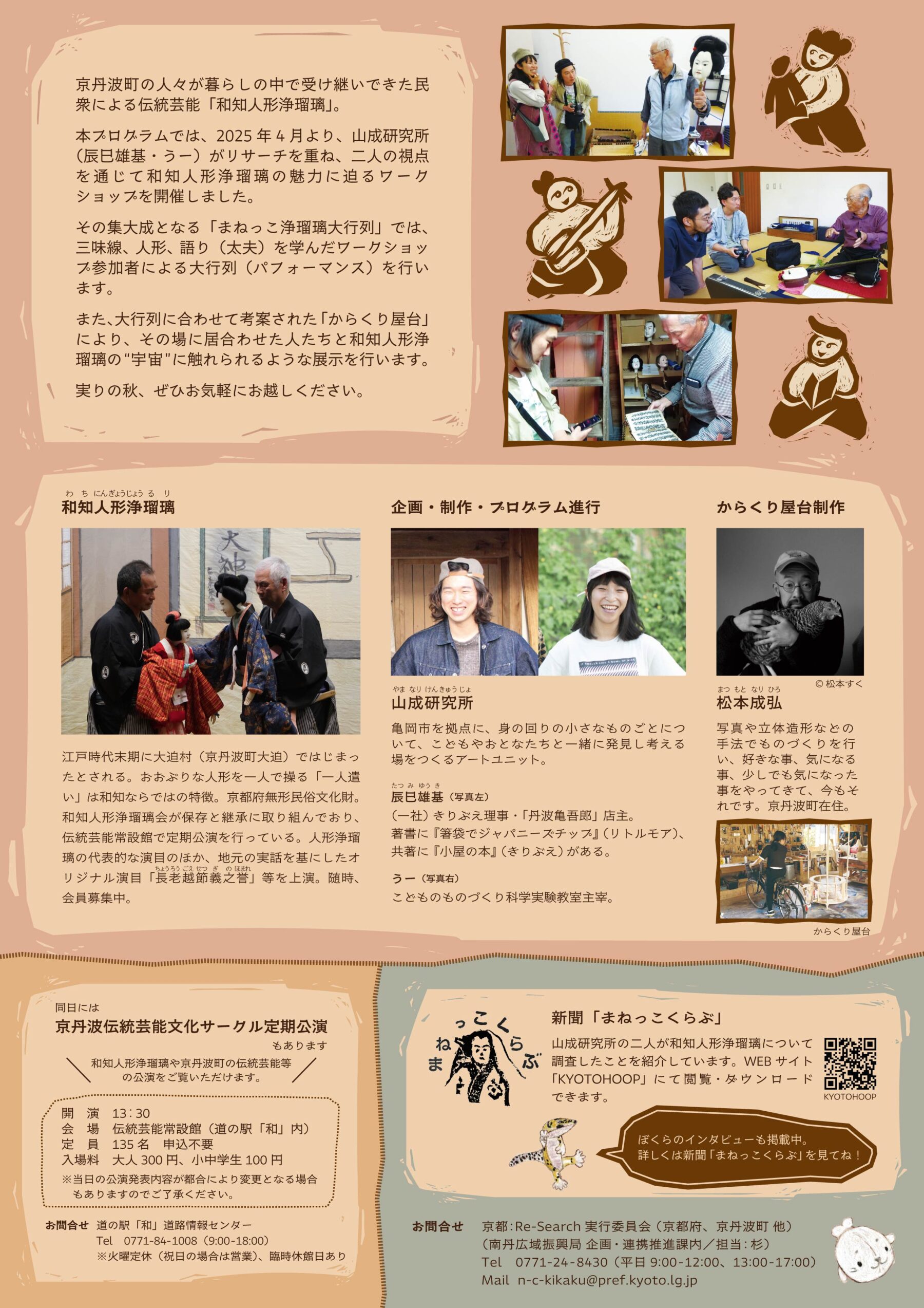 京丹波町の人々が暮らしの中で受け継いできた民衆による伝統芸能「和知人形浄瑠璃」。本プログラムでは、アートユニット・山成研究所(辰巳雄基、うー)の2人の視点を通じて和知人形浄瑠璃の魅力に迫るリサーチ、ワークショップ、パフォーマンスを行います。人形のつくりや感情を豊かに表現するための所作、三味線や太夫の語りについて紐解くほか、私たちの身近にある人形にも着目して、和知人形浄瑠璃を見つめ直します。