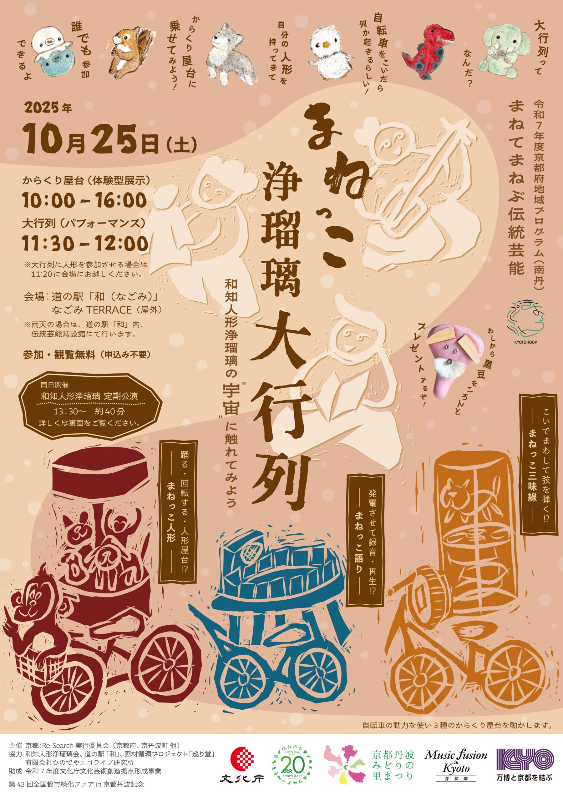 また、大行列に合わせて考案された「からくり屋台」により、その場に居合わせた人たちと和知人形浄瑠璃の“宇宙”に触れられるような体験型展示を行います。実りの秋、ぜひお気軽にお越しください。