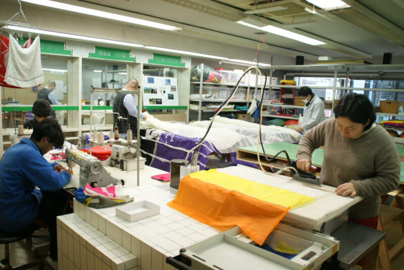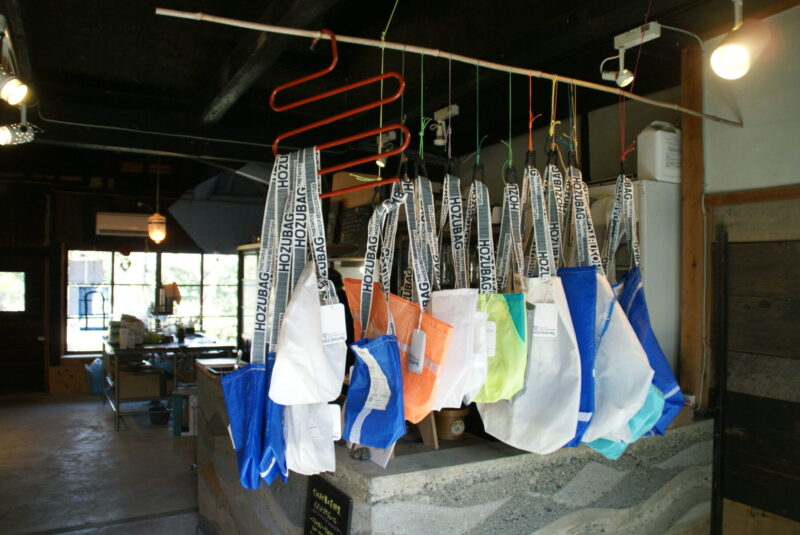 亀岡市から嵯峨嵐山へ流れる保津川から名づけられたHOZUBAG。海から雲となって雨となり、やがて山や川を巡り海に戻る水の循環のように、空を飛んでいたパラグライダーがHOZUBAG Mfg.のスタッフの手仕事を経てバッグに生まれ変わり、新たな持ち主に再利用されるというモノの循環が、日々、生み出されています。そしてその作業場は、働く人の個性や感性、創造性が発揮され、働く人がモノを生み出す喜びや楽しさを得られる場所でした。