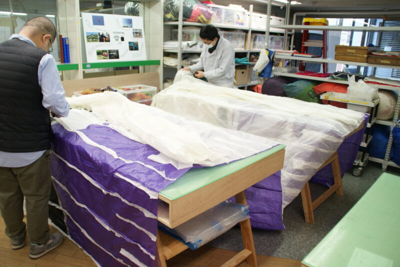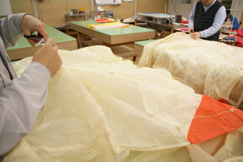 HOZUBAG の制作は、まず、国内各地から届く、飛ぶ役目を終えたバラグライダーの翼の解体から始まります。長さ10m前後ある一つの機体の翼から2枚(以下写真では、紫と白の2枚)の生地を取り出すために、翼にたくさんある接合部分をハサミで切り離し、翼を支えていた直径数ミリの骨や細いコード、付属物を一つ一つ丁寧に取り外していきます。この一連の作業は一体につき2人がかりで2~3時間を要するそうです。一体から生産されるバッグは、XLサイズ(横76㎝×縦45㎝×マチ31㎝)のバッグで約20個。