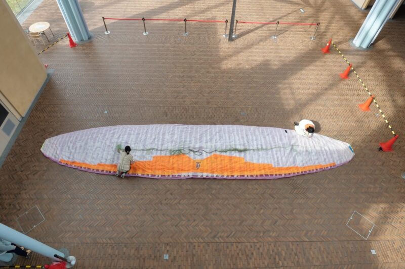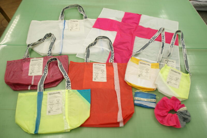 アーティストたちが素材探しをしていたところ、同芸術祭の総合プロデューサーである松井利夫さんが、亀岡の空を飛んでいたパラグライダーに着目。それまでは保管・廃棄するしかなかったパラグライダーの生地がバッグの素材に選ばれました。