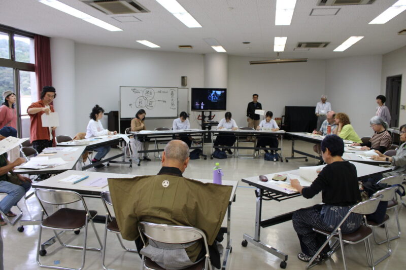 当日は、本プログラムへ初参加となる人もいたが、前二回のワークショップの参加者、小学生の時から授業で和知人形浄瑠璃に親しんでいる和知中学校の生徒たちが集まり、和やかな雰囲気であった。会場には、開始前から和知人形浄瑠璃会の公演映像とその音声が流れ、参加者を人形浄瑠璃の世界に誘っていた。
