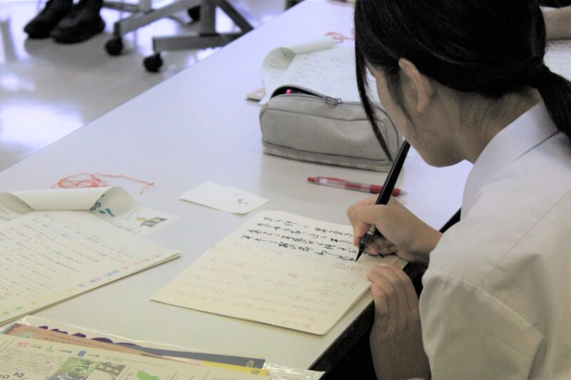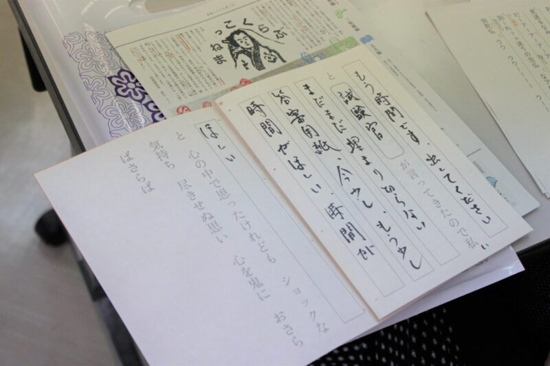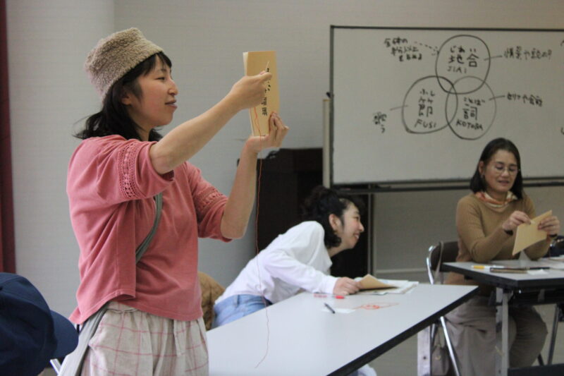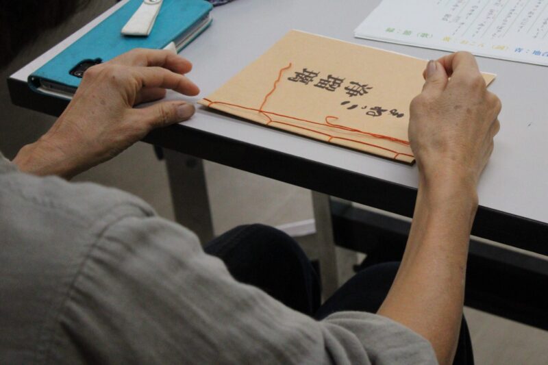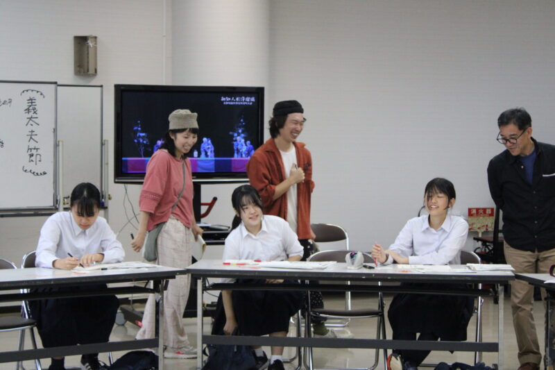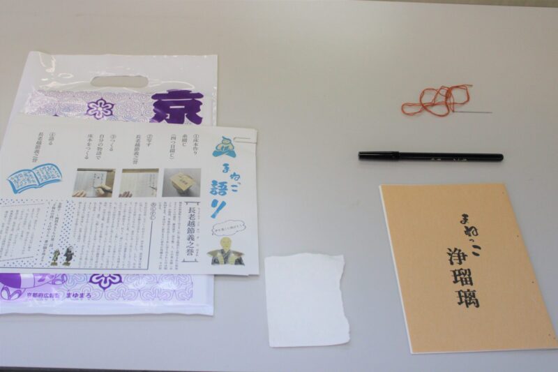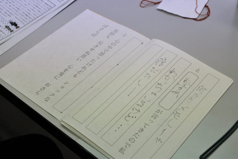 二つめは、「つくる(手を動かす)」という行為。つくる過程では、完成品を見聞きしたり、手にしたりするだけでは認知できていなかった細部が見え、新たな気づきを与える。また、自らの手で生み出したモノ(今回は床本)には愛着が芽生え、なかなか日常的に接することができない太夫(語り)や和知人形浄瑠璃との距離が縮まったのではないだろうか。