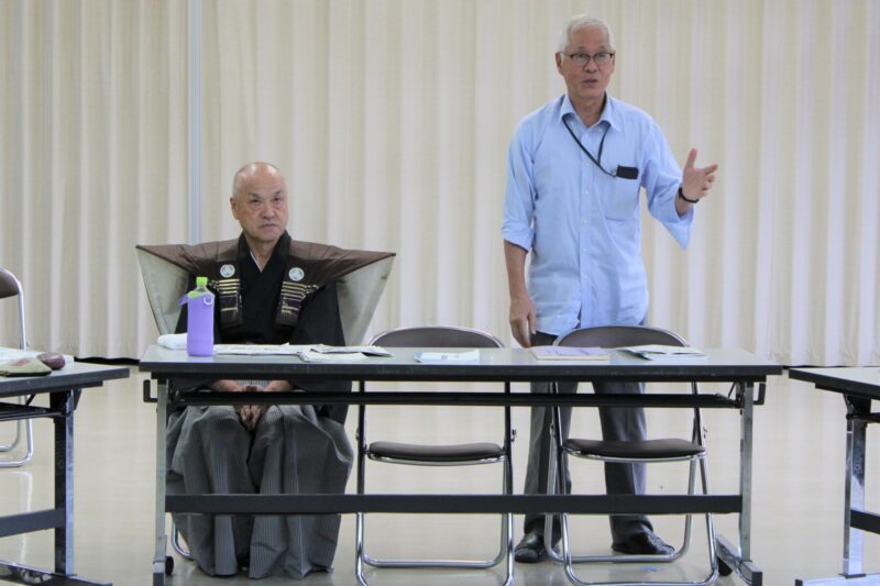 はじめに、和知人形浄瑠璃会の人形遣い・春田さんより『長老越節義之誉』の制作経緯とあらすじが紹介された。本演目は、江戸時代に京丹波町に実在した藤田猪平とその妻・お紺の物語。『子別れの段』では、雪が降る中、二人の子を連れ長老ヶ岳を越えようと歩いていたお紺が、背負っていた子が息を引き取っていることを知り、子を泣く泣く村人に預ける場面がある。長年お紺の人形を遣ってきた春田さんは、この場面で思わず涙しそうになる時があると言い、人形の心と一体になる人形遣いの姿が伝わってきた。また、和知人形浄瑠璃会の太夫・尾池さんによると、太夫の語りをきっかけに人形が動き、三味線は太夫と息を合わせながら物語を豊かに演出するため、太夫の語りは人形浄瑠璃の要とのこと。だからこそ、誰にでも届く「大きな声で語ることが大事です」と参加者に伝えていた。