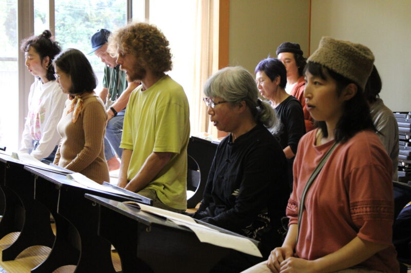 ワークショップの終盤には和室に移動し、床本を置く見台(けんだい)を前に正座し、上演時の太夫の所作をまねながら、再び皆で『子別れの段』の語りに挑戦した。太夫の尾池さんが参加者に伝えたことは二つ。「大きな声」で「物語の情景をイメージして」語ること。そのアドバイスによって、参加者の声に奥行きが生まれていた。さらにここで和知人形浄瑠璃会・小林さんが演奏する三味線の音色が加わり、参加者は物語の臨場感や太夫・三味線奏者の息遣いを感じ取っていた。その後、参加者の語りを一人一節ずつリレー形式で録音し、10月25日に行われたパフォーマンス「まねっこ浄瑠璃大行列」(大行列レポートリンク貼付)のからくり屋台“まねっこ語り”の仕掛けの一つとして再生された。