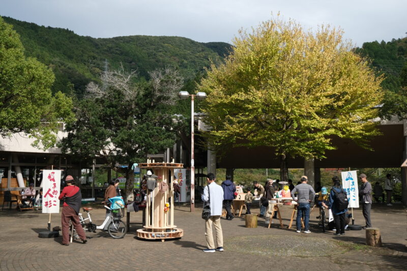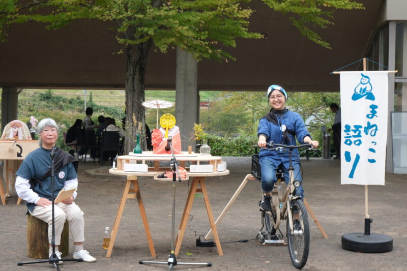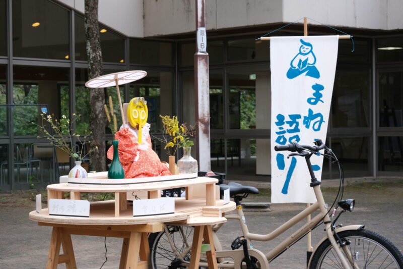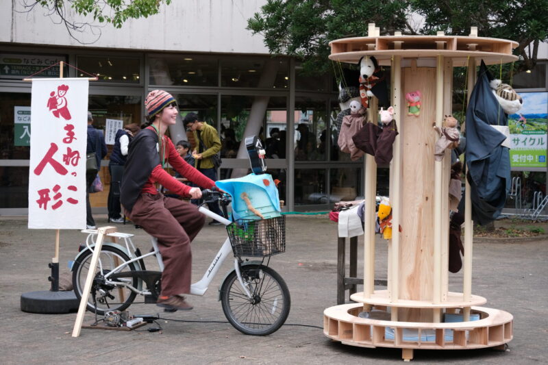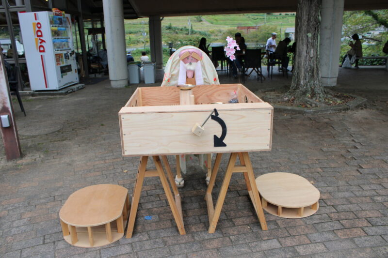 からくり屋台は、人形浄瑠璃を構成する三つの要素「三味線」「人形」「語り」ごとにそれぞれ用意されており、いずれも自転車のペダルをこぐことで動力を得る仕組みである。風変わりな仕掛けが施された屋台で体を使い遊ぶように楽しみながら、人形浄瑠璃の世界を覗き見る体験型展示だ。木製のからくり屋台が和知の自然景観と調和しながらも異彩を放つ様子は大変印象的でもあった。