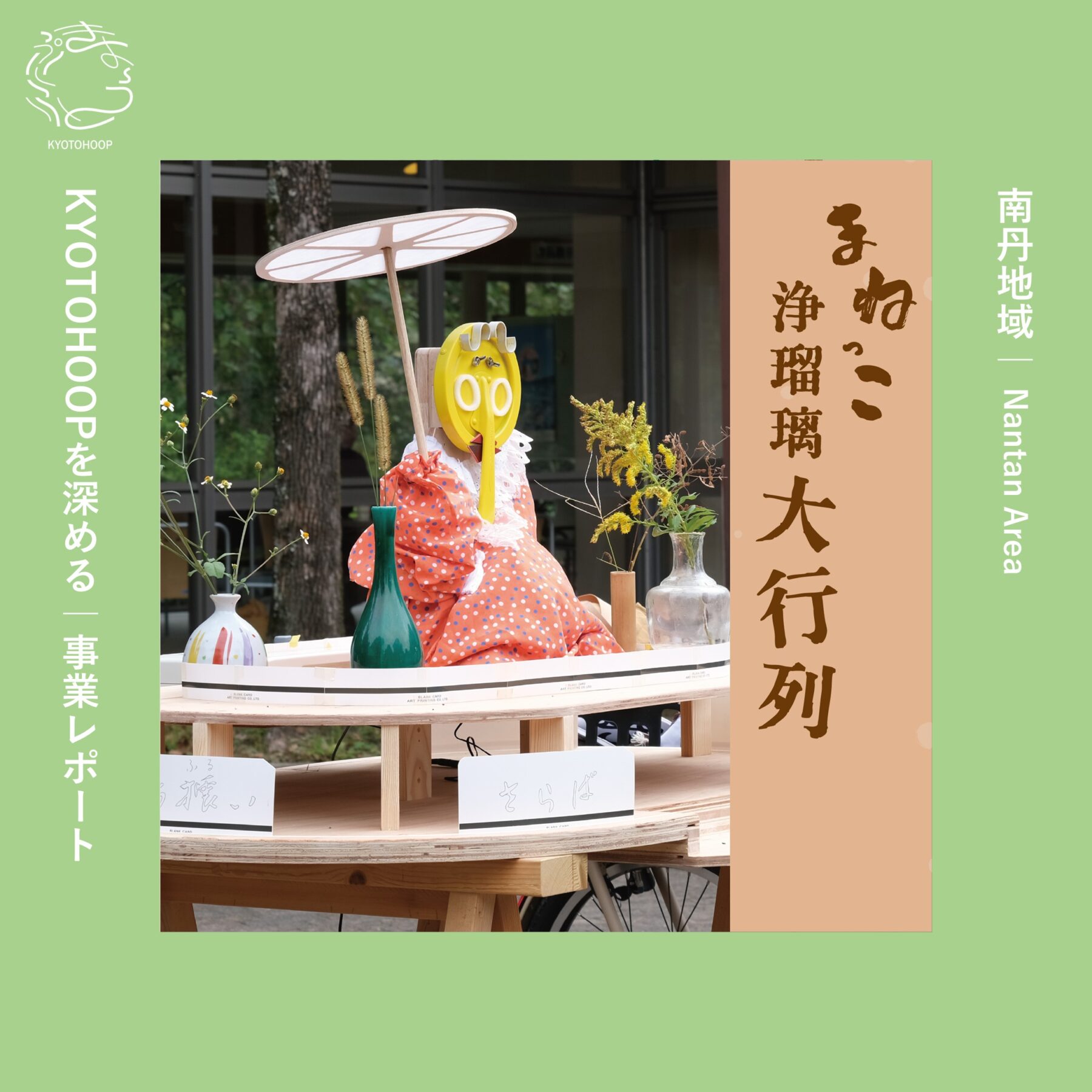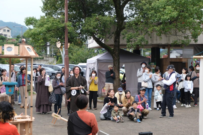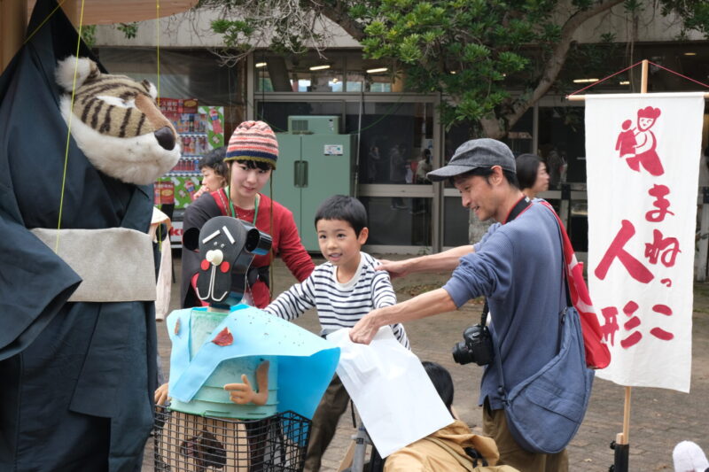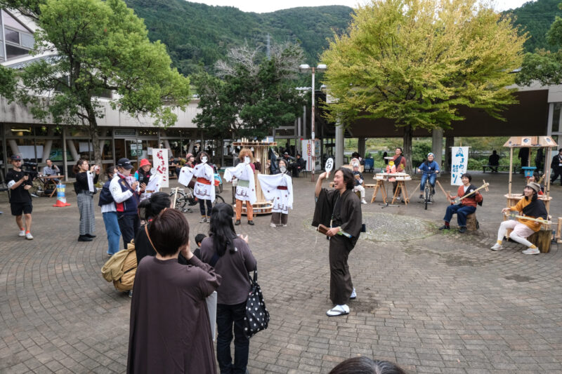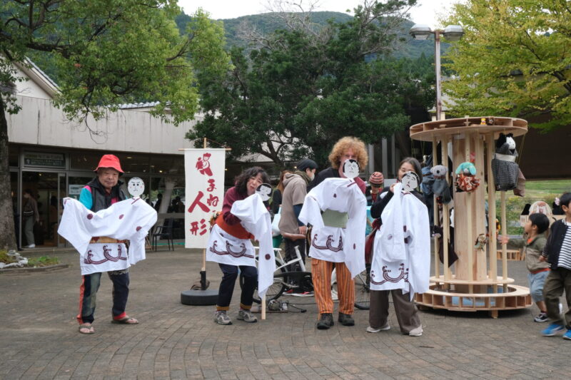 これまでに実施してきた「三味線」「人形」「語り」のまねっこワークショップ。その集大成となった「まねっこ浄瑠璃 大行列」は、道の駅「和(なごみ)」の野外広場「なごみTERRACE」にて開催された。屋内のクローズドな会場ではなく、観光客も多く訪れる道の駅というオープンな場で開催したことで、より幅広い層の来場者が気軽に立ち寄れる機会となった。