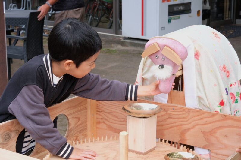 「三味線」「人形」「語り」屋台をまわるスタンプラリーで、三つのスタンプを集めると体験できるのが、「サドじい屋台」である。屋台中央には自転車のサドルの顔をもつ「サドじい」と呼ばれる人形が据えられている。屋台手前に設けられたハンドルを手で回すことで、小さなお皿が設置された回転台がゆっくりと動き、仕掛けによって「サドじい」の口から一粒の京丹波町の特産品、黒大豆が飛び出す。回転台のお皿のいずれかにうまく載れば成功、黒大豆を持ち帰ることができる。単純な仕組みでありながら、子どもから大人までを引き込み、会場には自然と笑顔や歓声が広がっていた。