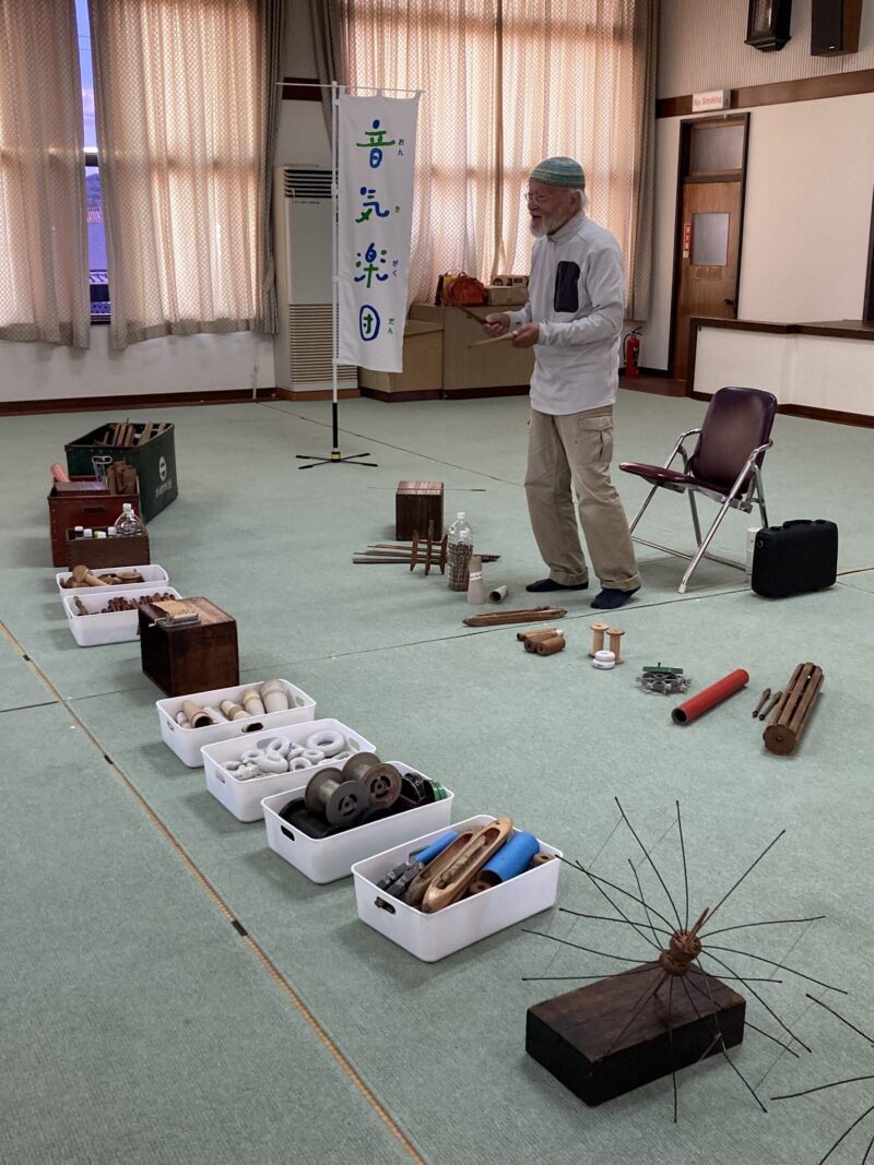 前回同様、昭男さん自作の音器「アナラポス」の演奏を聴くことで、参加者は昭男さんの表現方法に出会う。反響音やリズムを活かしながら、昭男さんの前に種類ごとに美しく並べられた機道具を楽器にしていくのがミッションなのだと伝えられた。