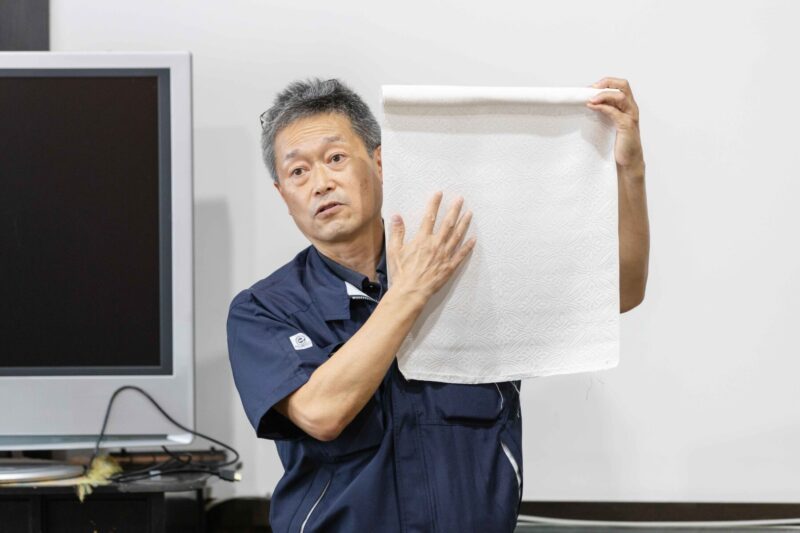 田勇機業株式会社代表取締役社長の田茂井勇人氏は、先代が「日向ぼっこの空間」に協力していて昭男さんと交流があった。工場の中で丹後ちりめんの話を聞く。同じ白生地でも、糸の撚りや柄の有無などで、まったく異なる表情がある。それを作りだすのは、機道具と工場で働く職人さんたちであり、「音 気 楽 団」が奏でようとしている音のイメージと重なった。