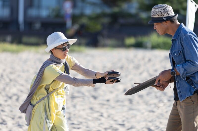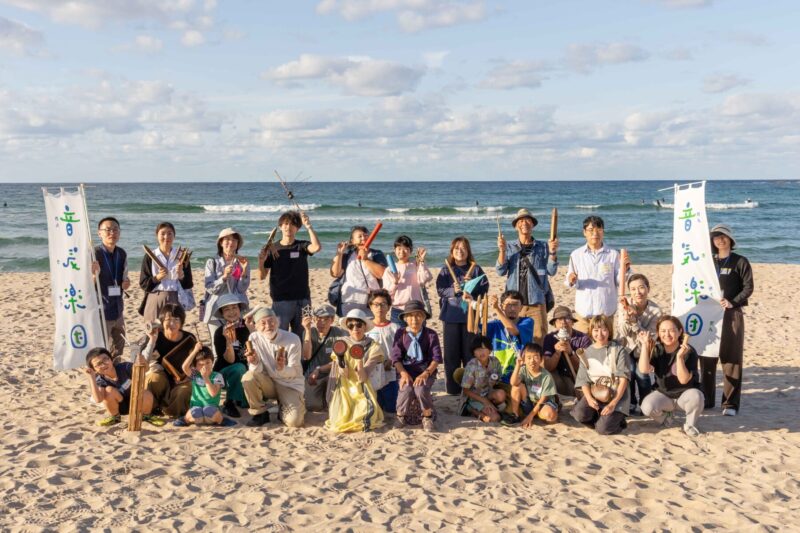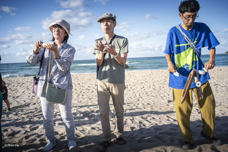 リズミカルな波の音を感じながら、持ってきた機道具で音を出してみる。みんなで一つの輪になって、となりの人から送られた音を「きき」、自分の音とリズムを重ねて、またとなりに送るということをくりかえした。