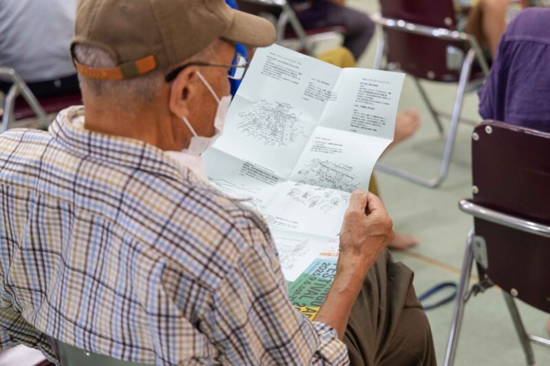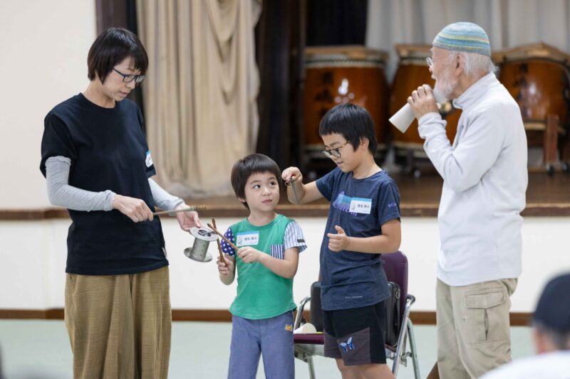 与謝野編から1週間が経った2025年9月27日(土)、浅茂川区民会館に新たな「音 気 楽 団(おんきがくだん)」の楽団員メンバーが集まった。このあたりは焼杉板の壁の機屋が並び、今でも「ガシャガシャ」という機音があちらこちらから響く。生まれてからずっと浅茂川で暮らす70代の方から、東京からやってきた20代の若者、丹後外の京都北部地域の子どもたちまで、今回も幅広い参加者が集まった。