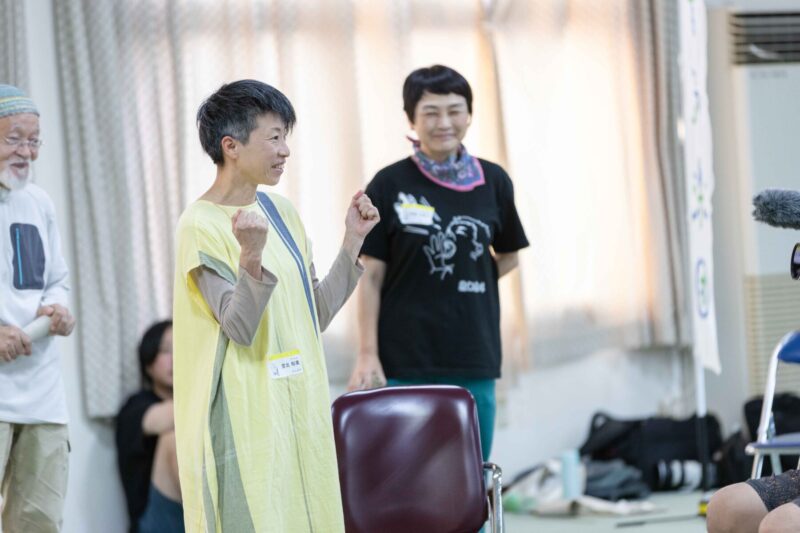 一人ずつから始まって、5人ずつ、半分ずつと増えて、最後には全員で。輪の真ん中に集まって「みんなで!自由に!」昭男さんが、リズムにのって呼びかける。