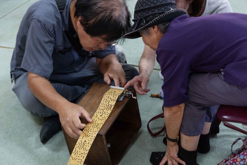 実家で機をやっていたという浅茂川の女性。「これがええわぁ~」と、ジャガード織機で模様を織るための紋紙を手回しオルゴールにセットしたものをずっと回していた。現代音楽のような音が流れる。まさか紋紙も、オルゴールにかけられる日がくるなんて思っていなかっただろう。時代が交錯するような気がした。
