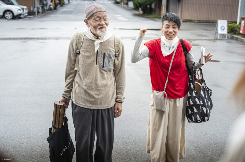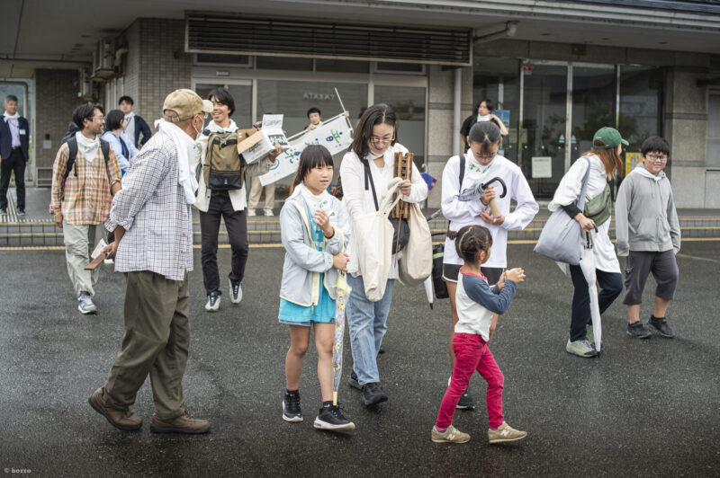 2025年10月5日(日)、集合場所の与謝野町加悦庁舎は朝から雨模様だった。与謝野編と京丹後編のワークショップに参加した「音 気 楽 団」の楽団員は、自分の楽器(機道具)を誇らしげに持ち、首にお揃いのちりめんバンダナを巻いて集合した。