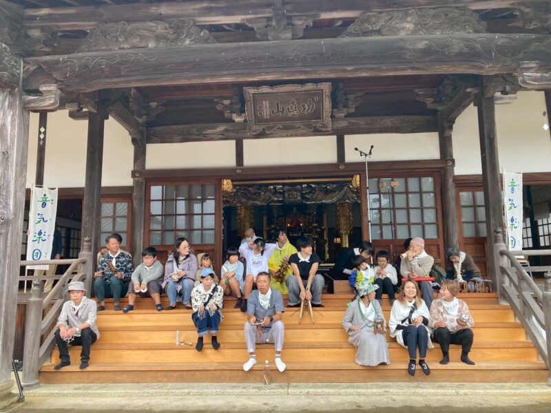 雨を考慮して、実相寺のお堂の上がり口でパフォーマンスを行うことになり、楽団員たちは靴を脱いであがっていく。それぞれが好きなところに座り、昭男さんもその中に混ざった。おお、何だかステージにぴったりの場所。