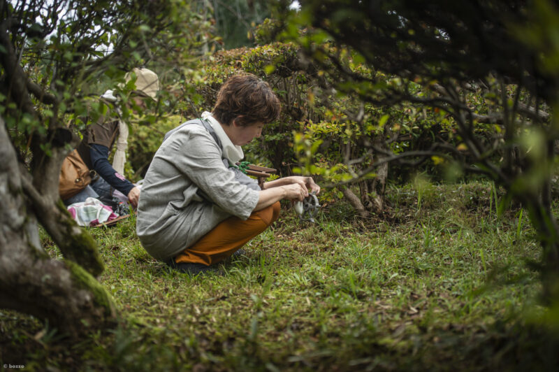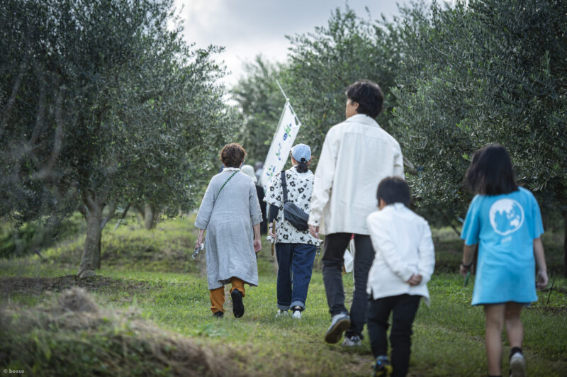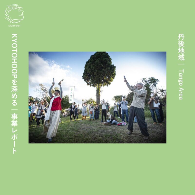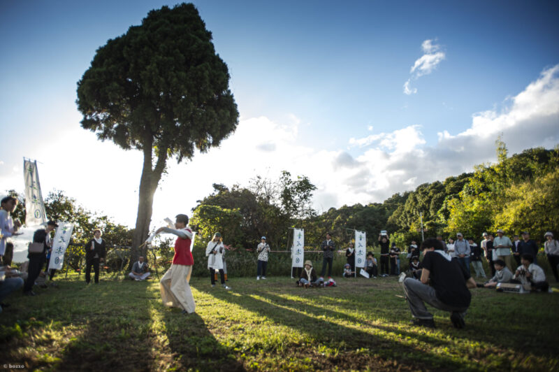 伊根の舟屋のエリアは通らず、宮津湾沿いから天平の古道沿いにあるオリーブ園、MAEDA OLIVE FARMへ。秋晴れという言葉がぴったりの青空は、ここまで3会場でのパフォーマンスを称えているようだった。大きな一本杉の麓には原っぱが広がり、日本遺産『丹後ちりめん回廊』構成文化財である「天橋立」を一文字に見ることができる。ここが最後のパフォーマンス会場だ。