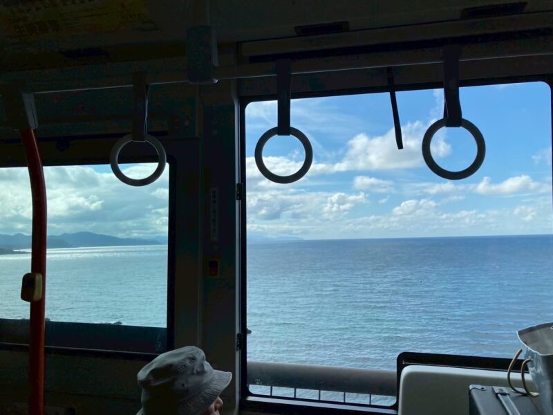 楽団員と鑑賞バスツアーの観客たちのランチは、京丹後の有機農場「てんとうむしばたけ」のお弁当。お昼には晴れ間が広がり、海辺で丹後地域の食の魅力をたっぷりと味わった。丹後半島をぐるりと伊根まで移動するのは、2台の丹海路線バス。その道は、山陰海岸ジオパークの地質遺産がのこる海岸線で、ユネスコ世界ジオパークに認定されている。