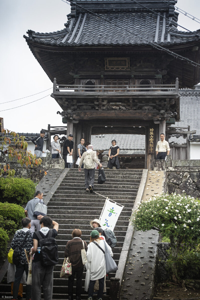 実相寺は、2005年(平成17年)に重要伝統的建造物群保存地区に選定された「ちりめん街道」にある。ちりめん街道では、現在でも多くの貴重な建造物が一般住宅として利用されている。楽団員が持つ楽器(機道具)は、きっとこの町並みの中でも使われているだろうと感じられる風景の中に、大きな石階段が現れた。