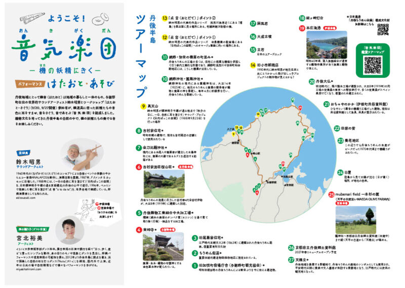 機道具を楽器とした音の表現を通じて丹後地域を見つめた今年度のKaico―参加型アートプロジェクト「音 気 楽 団-機(はた)の妖精にきく-」。楽団長であるサウンドアーティスト鈴木昭男の感性に触れ、参加者がどのように音をさぐり、丹後半島4カ所を巡りながら、パフォーマンス「はたおと・あそび」として表現していったのでしょうか。丹後で暮らした経験もある、ライター・コーディネーター稲本朱珠さんの言葉を通じた追体験をお楽しみください。
