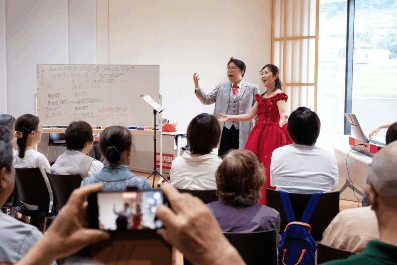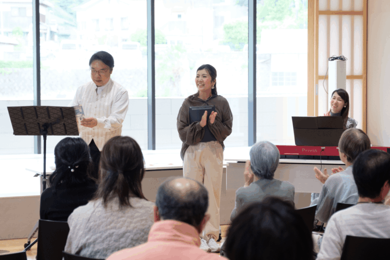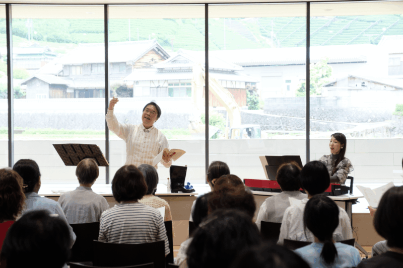 第3部は講師2人によるミニコンサートを開催。本編ワークショップで取り組む合唱曲、ヴェルディ作曲オペラ《椿姫》より「乾杯の歌」のソロ部分を、ソプラノの東氏とテノールの竹内氏が披露した。正装して登場した2人の姿に参加者からは歓声が上がり、窓の外に広がる和束町の茶畑を背景に歌い上げられたオペラの名曲を、皆が堪能する時間となった。