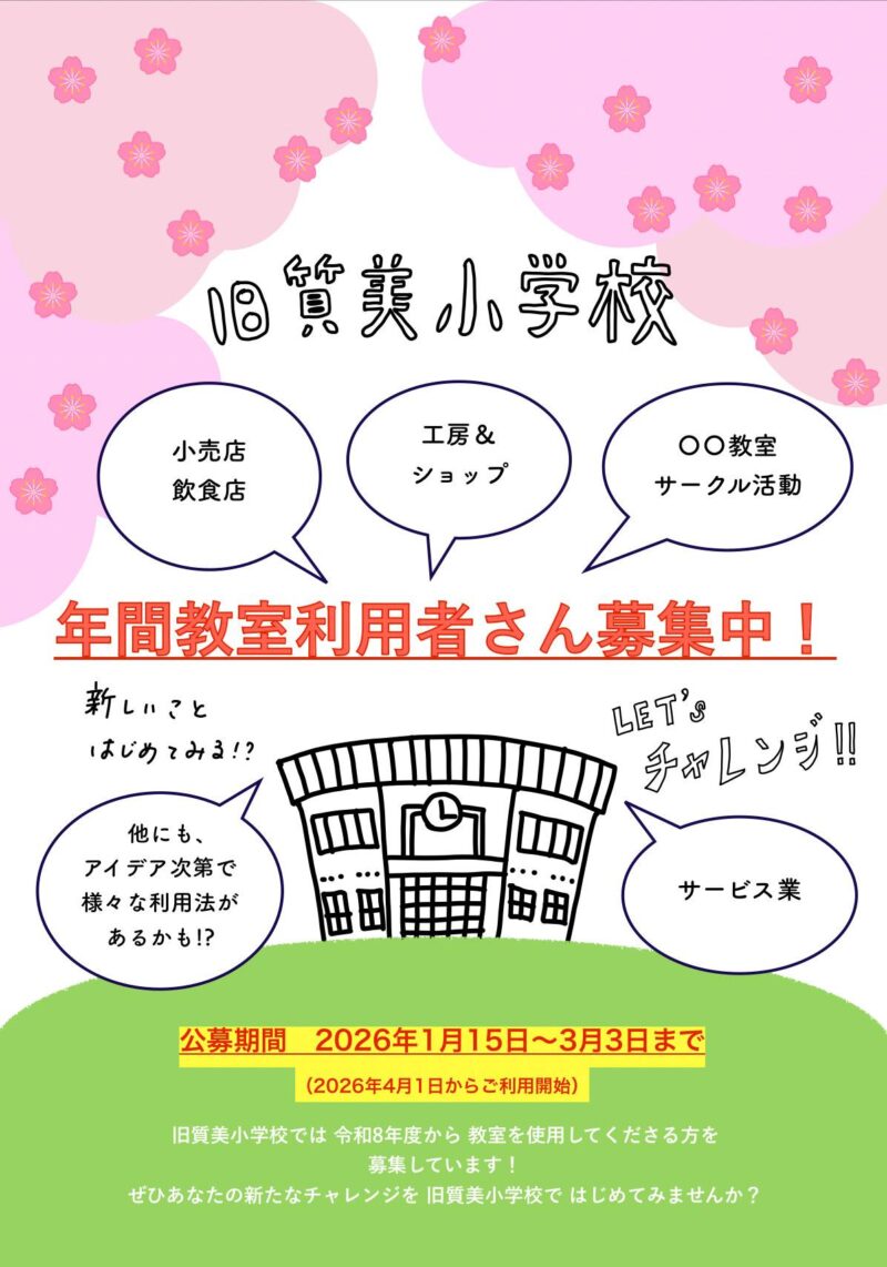教室利用申込書に記入のうえ、3月3日までに絵本ちゃん(旧質美小学校内)へ提出。